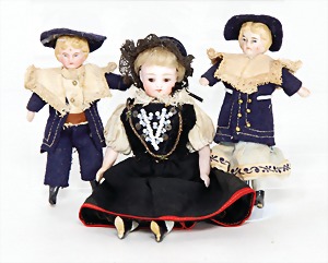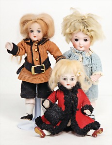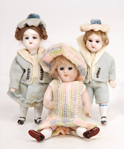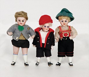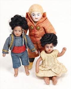 3 Ganzbiskuit-Puppenstuben-Puppen, Kinder, 9,5 cm, fest eingesetzte Glasaugen, Perücke, anmod. Kleidung