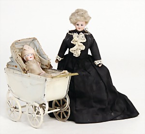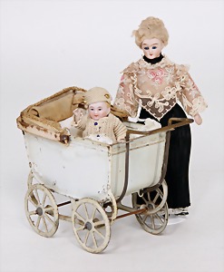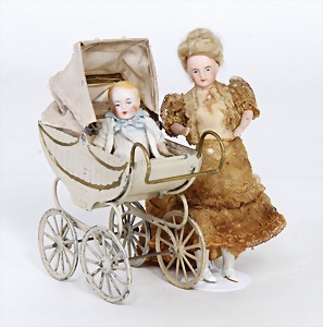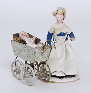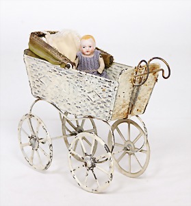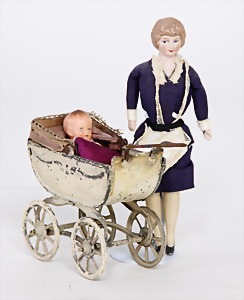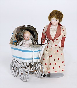 Puppenstuben-Puppe, Haushälterin, 12,5 cm, Biskuitbrustblatt-Kopf, -Arme u. -Beine, Stoffkörper, schöne Orig.-Kleidung, dazu kl. Kinderwagen, Blech lithogr.