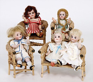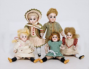 5 Puppenstuben-Puppen, Ganzbiskuit, Kinder, 9,5 - 10 cm, feste Köpfe, fest eingesetzte blaue Glasaugen, alte Kleidung, für Puppenstube oder Schule