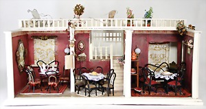 Puppenstuben-Gehäuse, 3-tlg., mit Dachterrasse u. Aufgang, 80 x 33 x 35 cm, mit 3 x Thonet-Sitzgarnitur, samtbezogen, dazu einige Ausschmückungsteile, Porzellan-Kaffee-Service, gr. Wandspiegel, Perlenvorhang, Wandlampen u. anderes