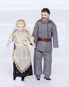 2 Puppenstuben-Puppen, Soldat, 17 cm, Biskuit-Brustblatt-Kopf, -Arme u. -Beine, aufgemalter Schnurrbart, Stoffkörper, Filzkleidung, Dame, 15,5 cm, Biskuit-Brustblatt-Kopf, -Arme u. -Beine, Stoffkörper, Kleidung alt o. aus alten Stoffen genäht