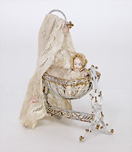 filigrane Puppenstuben-Wiege, Zinn, 13,5 cm, mit kl. Ganzbiskuit-Baby, Orig.-Stoffbezug