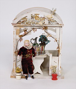 Puppenstuben-Wintergarten, Höhe 23 cm, mit Biskuit-Brustblattkopf-Puppenstuben-Puppe, einige Teile Zubehör
