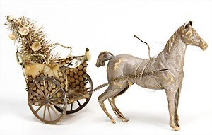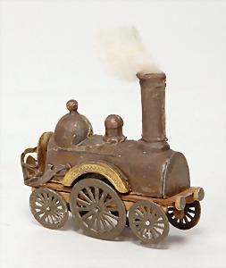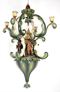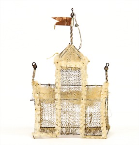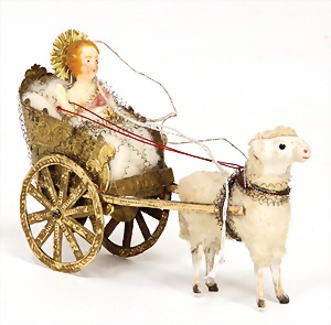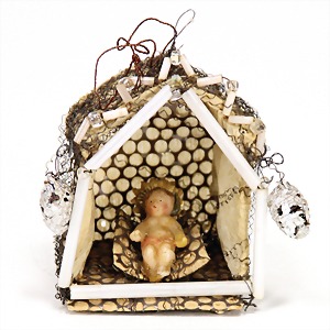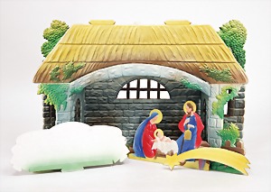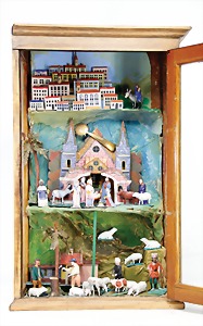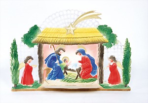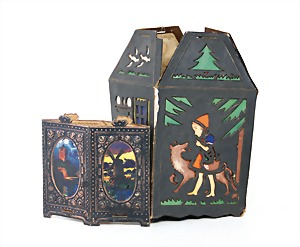 Christmas box shaped like a crib, can be lit up from both sides, lithographed sheet metal, 26 cm tall, 30 cm wide, cover with scratches on the paintwork that are caused of old age, original condition