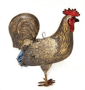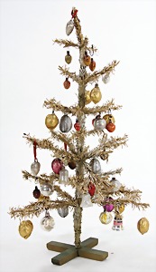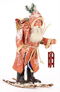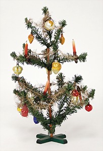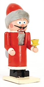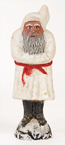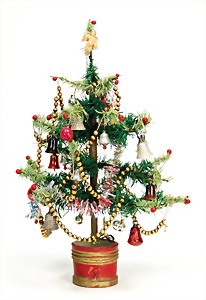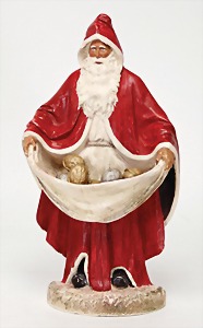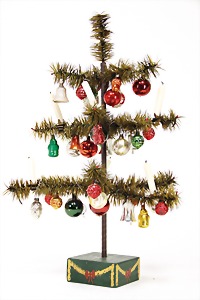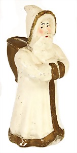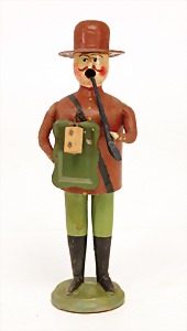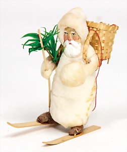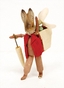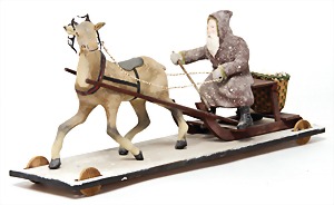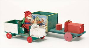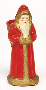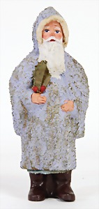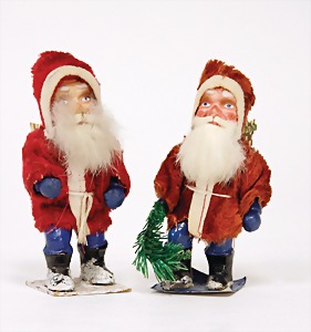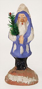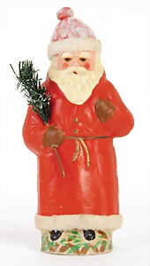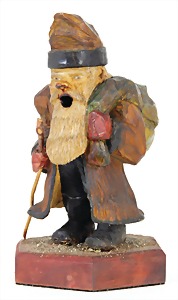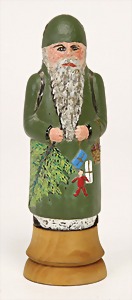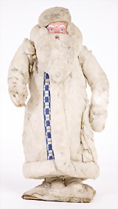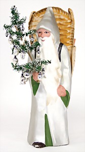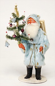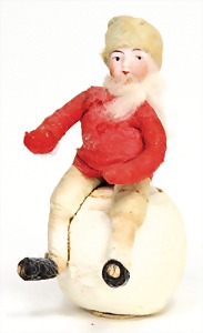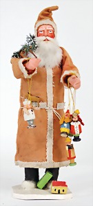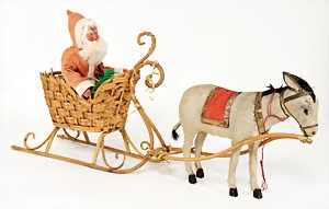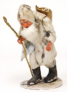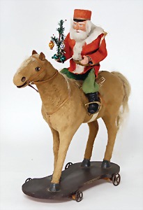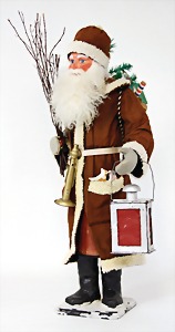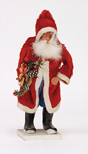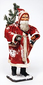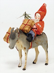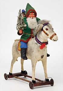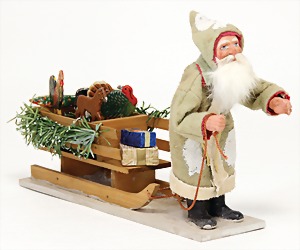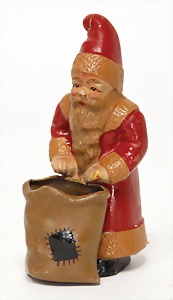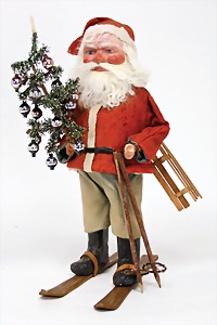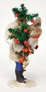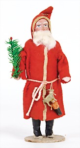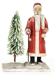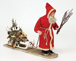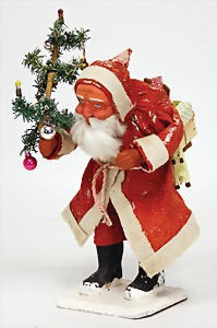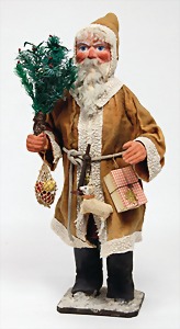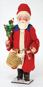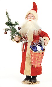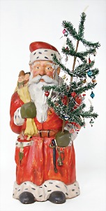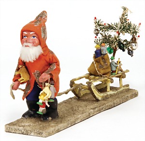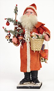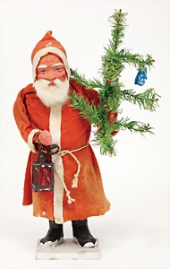 Candy-container, Santa Claus with pannier and tree, 47 cm, papier mâché head, arms, and legs, felt clothes, with tree and bag of presents, bell is more recent, with slight formation of cracks in facethat are caused of old age
