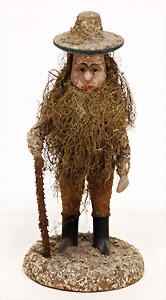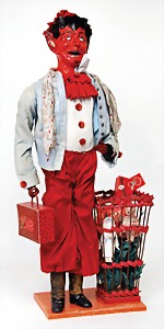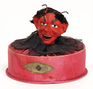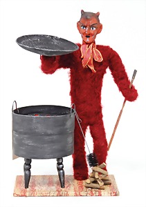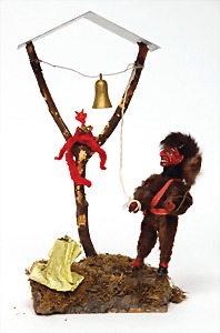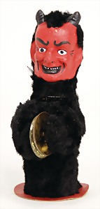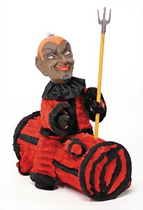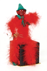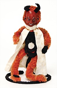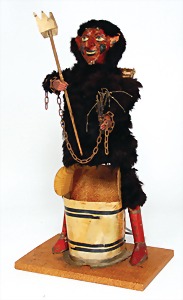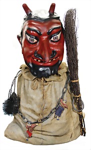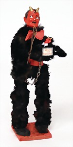 Krampus, head nodder, clock mechanism drive is intact, 80 cm, papier mâché head and body, mass arms and legs, original clothes made of fabric, crepe paper hat and collar, very nice original condition