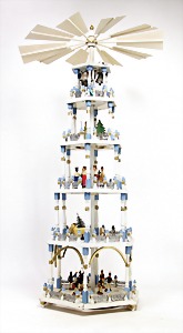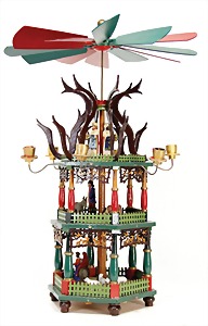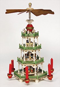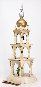 Christmas pyramid, around 1900, 75 cm tall, wood, colored frame, some mass or carved figures, some figures are missing, with 6 candleholders, possibly were in lower area also another candle holder intended, some pieces are loosely enclosed, decorative