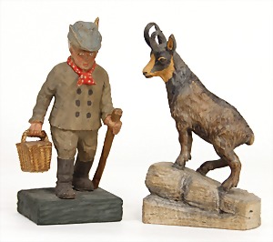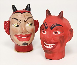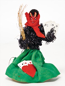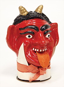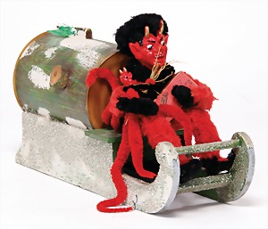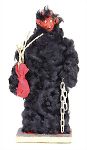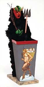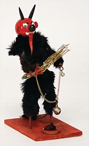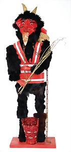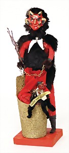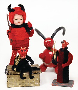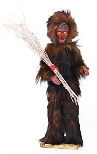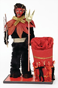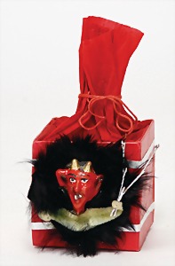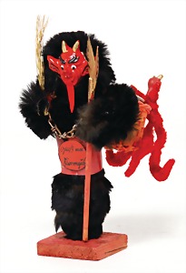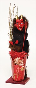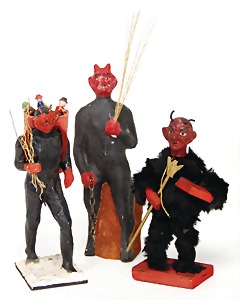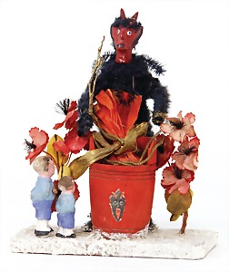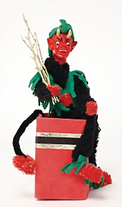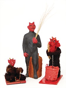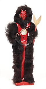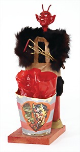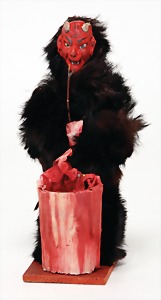 candycontainer, devil, 23 cm, papier mâché head, wrapped with pipe cleaner, small Krampus on a box, 1 Krampus made of velvet, mass head, on a wooden board, 13 cm, 1 Krampus made of wood