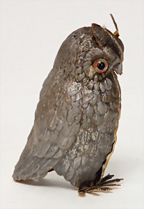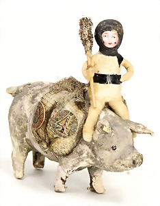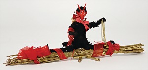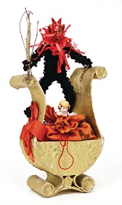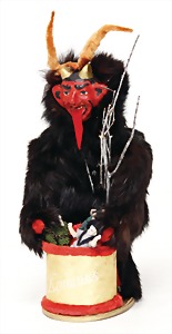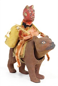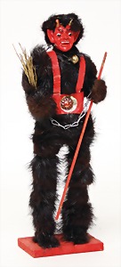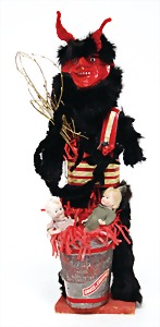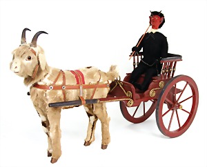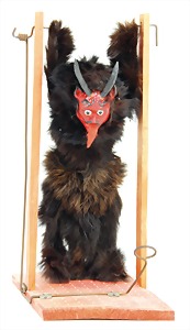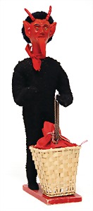 Krampus on a satchel, with pannier, window decorations, lifts the arms, electric drive is intact, 60 cm, papier mâché head, arms, and legs, pelt made of wool, pannier is caused of old age slightly worn