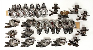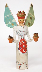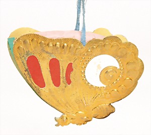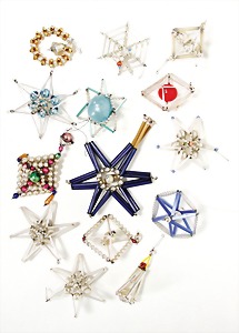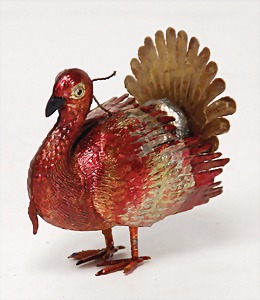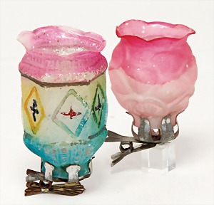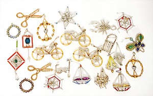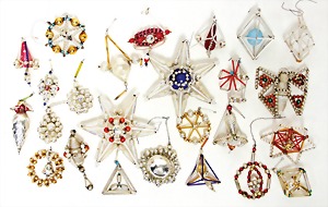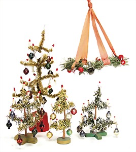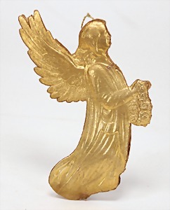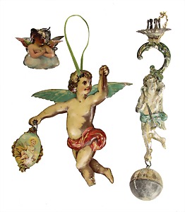 3 pieces Christmas tree decoration, lithographedsheet metal, candle holder with ball, 19 cm, color is caused of old age wear down, angel, 1 foot is break off, 1 clamp, slightly deformed