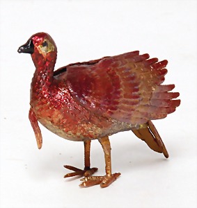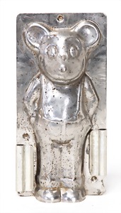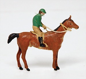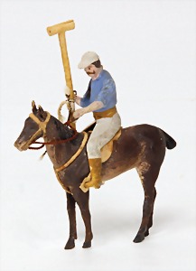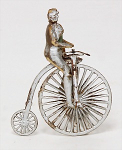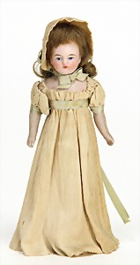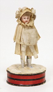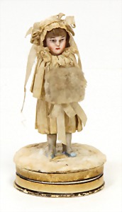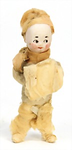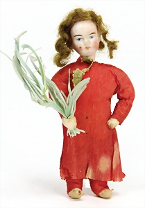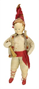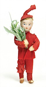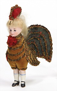 doll with porcelain head, blue inset glass eyes, closed mouth, small repaired part at the left eye, mohair wig, porcelain legs, with modelled shoes and socks, dressed like a cock, 10 cm