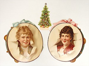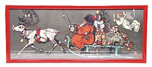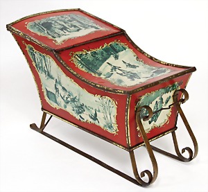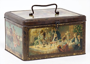 Christmas box, lithographed sheet metal, with a scene: handing out of presents, width: 23 cm, height: 9 cm, small tender spot at the side, with small scratches on the paintwork that are caused of old age