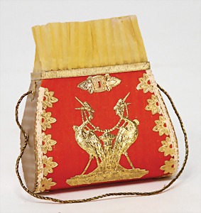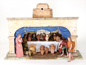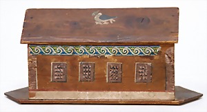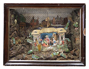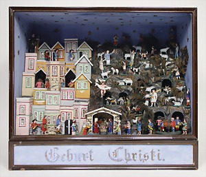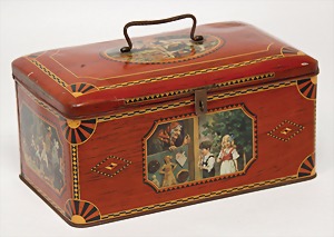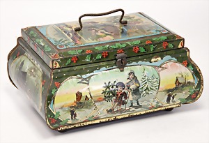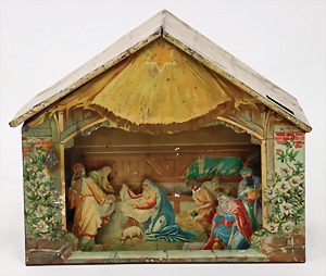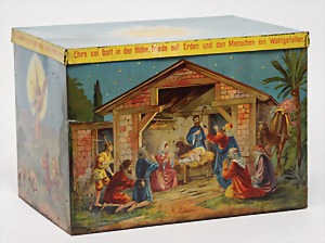 Christmas box, sheet metal lithographed, "Ehre sei Gott in der Höhe, Friede auf Erden und den Menschen ein Wohlgefallen" (glory to God in the highest, peace on earth, good will to all people), with crib scene all around, 30 x 22 cm, the traces of usage arecaused of old age, original condition