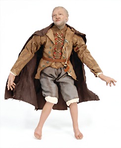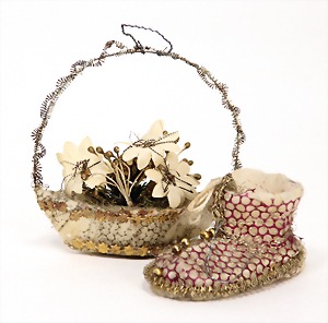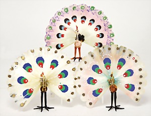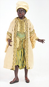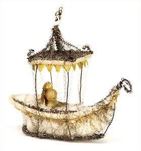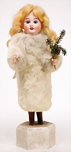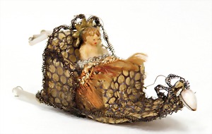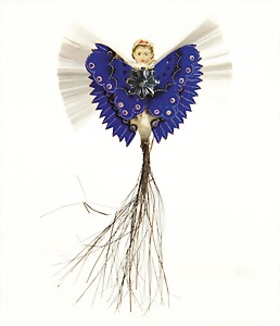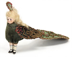 Christmas tree decoration, porcelain doll, blue fix inset glass eyes, closed mouth, mohair wig, porcelain legs, with modelled shoes and socks, dressed like a peacock, 10 cm, clothes are embroidered with beads