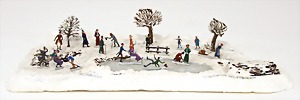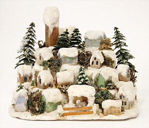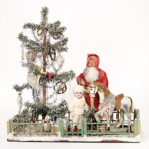Christmas scene, garden, 41 x 20 cm, height: 42 cm, wood/mass, wooden fence, Santa Claus, Candy container, small doll with bisque porcelain head, decorated christmas tree