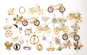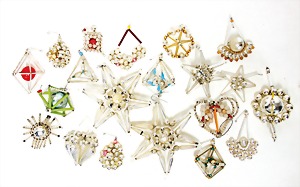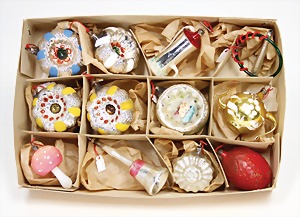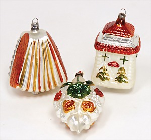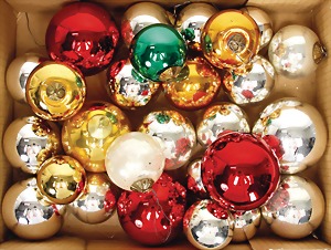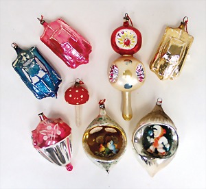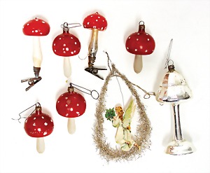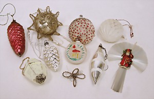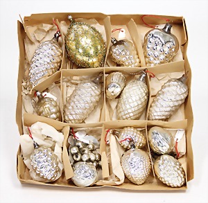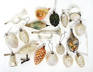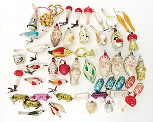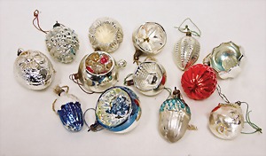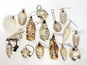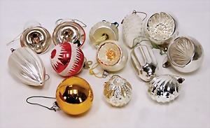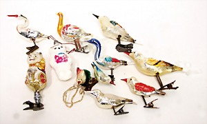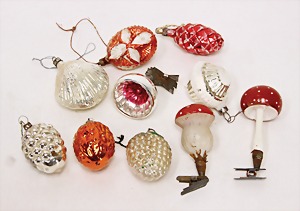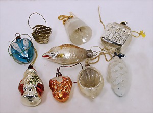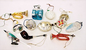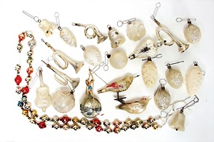 16 pieces Christmas tree decoration, mostly mirror glass, birds, trumpet, cone, bell, mostly in good condition, partially with scratches on the paintwork