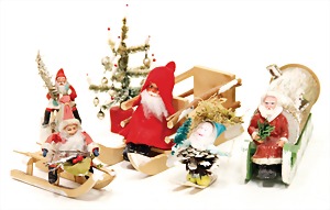 mixed lot of Christmas parts, partially older, partially more recent, Santa Claus with sledge, Candy-container, 16 cm, christmas tree, Santa Claus with crepe clothes on a sledge