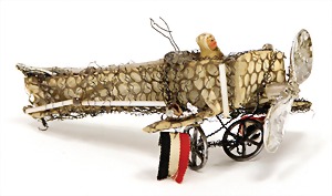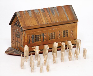 board Noah`s ark, with straw feneer, at the side intimitated windows, in front door, front can be pushed away, with natural wood animals, mostly in pairs, 28 cm, in a box made of chipboard, unusual