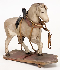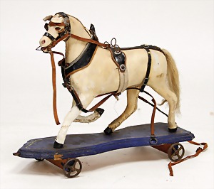 draft horse, wood, pelt covered, strongly worn, with bridle, mounted on a wooden board, with cast spoke wheels, before 1900, 30 cm