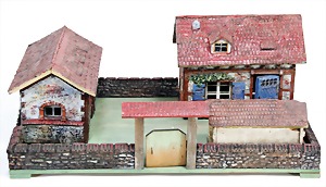 farm, wood/mass, surface area 56 x 35 cm, gate, 2 buildings, wall parts, used original condition, partially with formation of cracks that are caused of old age