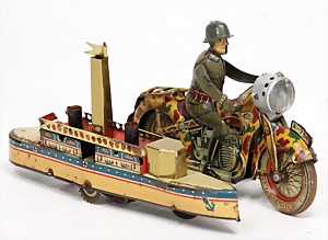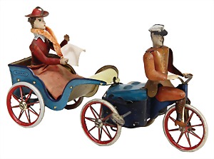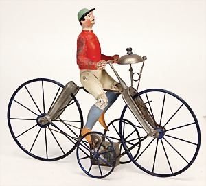 cyclist, handpainted sheet metal, around 1900, 30.5 cm, face was colorwise slightly retouched, 2 spokes of the carrying wheel are broken, clockwork box was fixed with wire, otherwise good, rare
