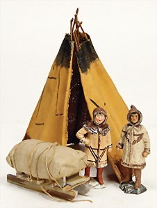 Inuit, man, not marked, woman, marked, 11 cm, with rare sledge, condition 2, with rare Inuit tent, Hausser, No. 6333