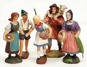 4 pieces mass figures, 10 - 10.5 cm, 2x Elastolin, rare maid with basket (lineol), farmer's wife with basket and umbrella, 2x not marked, 1 hand is missing, otherwise condition 2