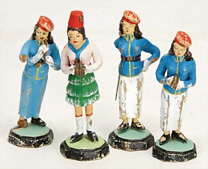 early mass figures, girl with uniform, playing music, 7.5 cm, original condition, the scratches on the paintwork are caused of old age, 1 arm is missing, 1 arm is broken, rare