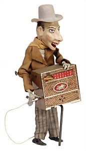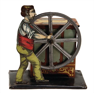 drive model, man at barrel organ, with music mechanism, lithographed sheet metal, height: 13 cm, with small tender spots at the base plate, good condition, music mechanism is intact