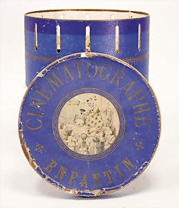 Cinematographe Enfantin, with 2 filmstrips, original cover, with multicolored lithographed cover picture, worn at edge, with a diameter of 25 cm