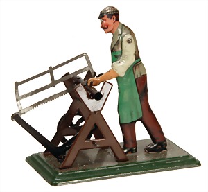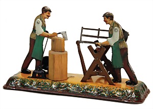 drive model, lithographed sheet metal, 1x man at saw, 1x with hatchet at chopping board, height: 16.5 cm, used, 1 strap at 1 foot is break off, small soldered joint at the saw