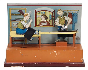 drive model, shoemaker, with 2 jointed figures, woman on a window, nodding, lithographed sheet metal, c. 1910, height: 16.5 cm, nice original condition, base with small scratches on the paintwork, decorative