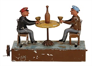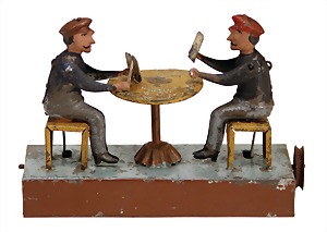 drive model, card players, around 1900, handpainted sheet metal, used, the scratches on the paintwork are caused of old age, 1 card at 1 figure is possibly missing, height: 11.5 cm