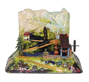 landscape, mountain, water mill and pond, drive model, handpainted sheet metal, 28 x 19.5 cm, nice original condition