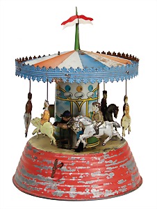 roundabout, lithographed sheet metal, 27 cm, 6 figures and A man at the crank, clock mechanism and music mechanism are intact, the scratches on the paintwork are caused of old age, original condition, decorative