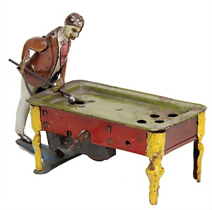billiard player, lithographed sheet metal, 16 cm, used, the scratches on the paintwork are caused of old age, clock mechanism is intact