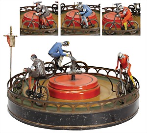 bicycle racecourse, with 3 bicycles, with a diameter of 32 cm, handpainted sheet metal, wheels rubber tyres, original rubbers with formation of cracks that arecaused of old age, the scratches on the paintwork are caused of old age, original condition, rare, around 1900