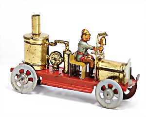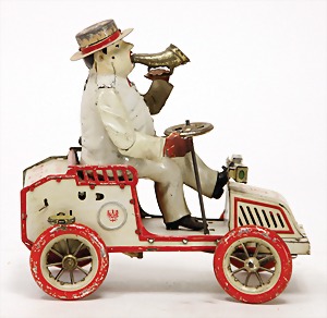 Meier, lithographed sheet metal, 8 cm, with driver figure, 4 lithographied figures, flywheel drive, good condition, unusual