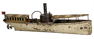 steamship, c. 1905, 47 cm long, handpainted sheet metal, with steam drive, with burner, used, the stronger scratches on the paintwork are caused of old age
