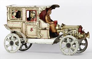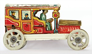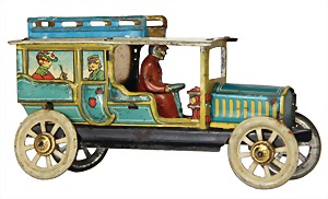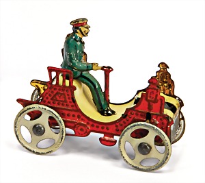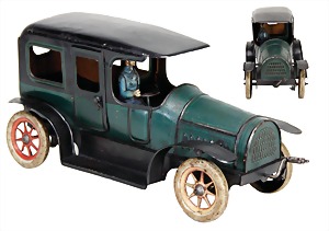 Landaulet, c. 1910, 10.5 cm, lithographed sheet metal, flywheel drive, with driver figure, and also 4 intimitated persons, with small scratches on the paintwork that are caused of old age, good condition, unusual