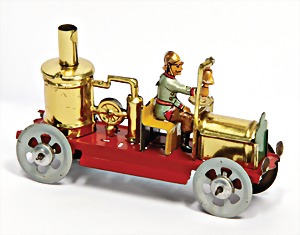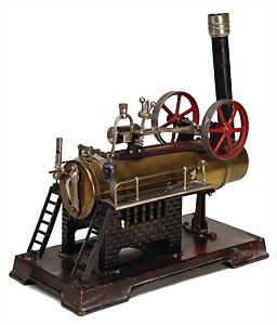 stationary traction engine, 12 x 26 x 28.5 cm, boiler in diameter 8 cm, water level glass, whistle, funnel, burner, feed pump, nice original condition