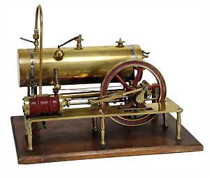 690/4, steam engine for ships, around 1910, 30 x 15 x 45 cm, boiler brass, burnished, with a diameter of 9 cm, with burner, water level glass, whistle, feed pump, regulator of centrifugal force, funnel original?