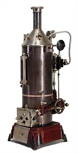 standing steam engine, 35.5 cm, boiler in diameter 7 cm, burnished brass, with burner, manometer, water level glass, pipe, funnel, good condition