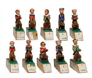 10 small wooden figures, monkeys playing music, on a wooden base, handpainted, small parts are break off, base stuck with paper, with French text, probably game pieces, height: 6 cm