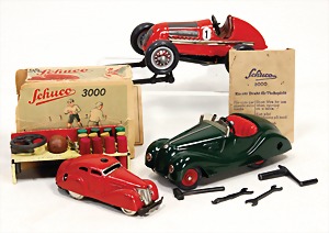 Fischer, opened touring cars, with driver figure, pointed radiator, c. 1910, 11 cm, good condition