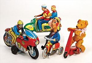 4 pieces, 1x motorbike, lithographed sheet metal , friction drive, 20 cm, boy on a tricycle, more recent, clock mechanism drive, 15 cm, bear on a scooter, 14 cm, filling at leg is missing, 1 scooter, probably Technofix, friction drive is faulty, windshield is missing, one side with rust
