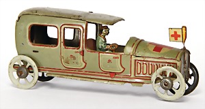 Meier, Landaulet, ambulance, 10.5 cm, lithographed sheet metal, with driver figure, with flag, 1 side with a little bit rust, and with scratches on the paintwork