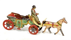 saloon, lithographed sheet metal, with driver figure, crank drive, height coil spring mechanism: 25 cm, used, partially retouched, pieces were possibly supplemented, please have a look at it