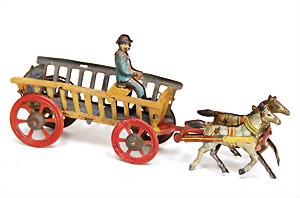 Meier, horse and cart, with 2 draught horses, figure, lithographed sheet metal, 11.5 cm, slightly used