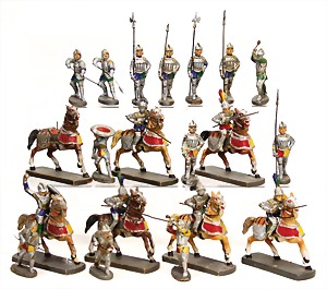 knight, mass, 6 rider, 1 single horse, 13 pieces standing, fighting or marching, condition 3, some figures with small patches with flaws